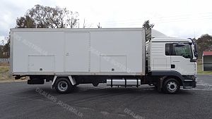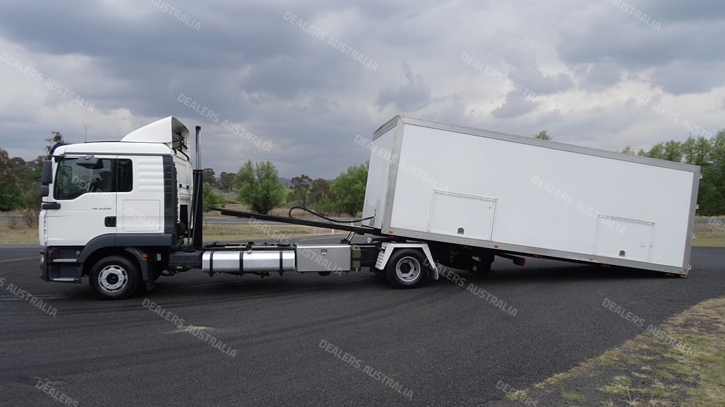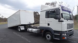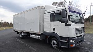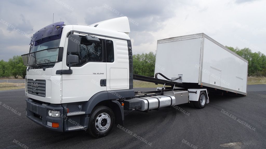 MAN TGL 12.240 TILT SLIDE WITH INCLOSED PAN , YEAR -01/2007, LOW 267300 KMS, 240 HP TURBO INTERCOOLED, ZF AUTOMATIC WITH NO CLUTCH, GOOD SIZE SLEEPER IN CAB, EKEBOL BRAND BODY WITH FULL REMOTES, 11990 GVM, 16480 GCM, 5200MM WHEELBASE, 6300 MM L X 2350MM W X 2000MM H INSIDE MEASUREMENTS, HYDRUALIC WINCH FITTED INSIDE PAN, , 4 AIRBAG SUSPENSION, DUAL FUEL TANKS, REAR TOWBAR FITTED, TRUCK DRIVES LIKE A CAR AND GOES VERY WELL, S/N - 2262, PRICE - $119,900.00 INC GST, LOCATED IN ARMIDALE NSW