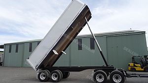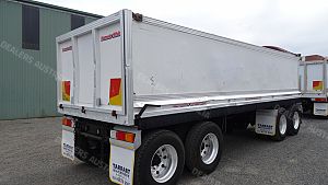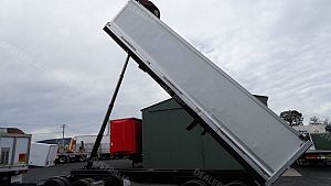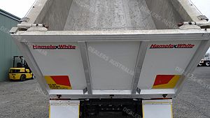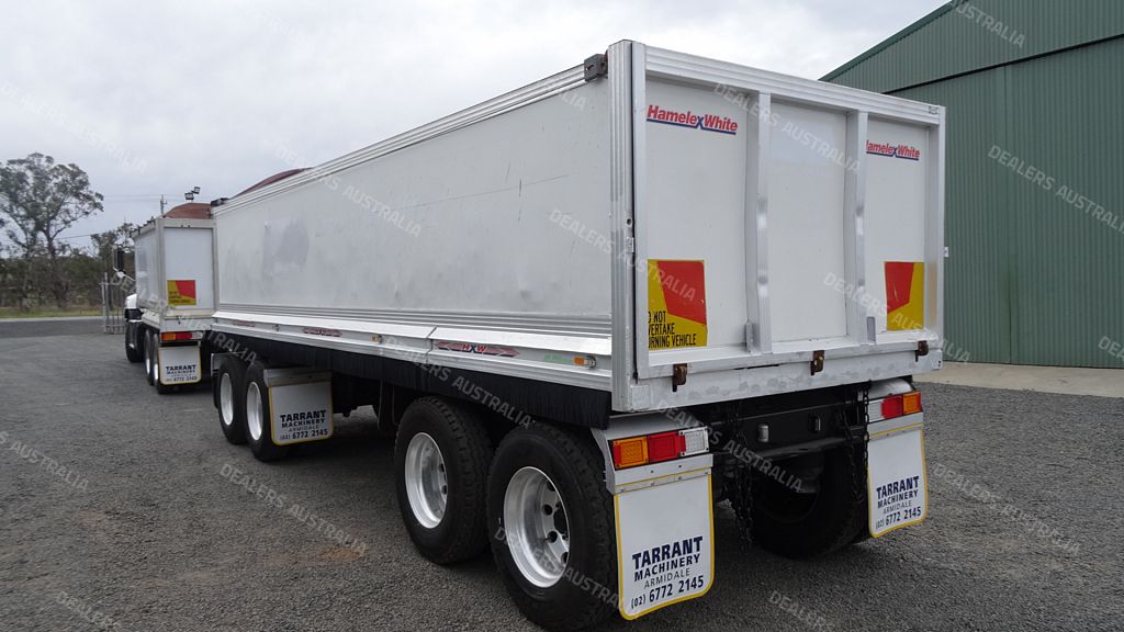 HAMELEX WHITE D4 QUAD AXLE CHASSIS TIPPER, YEAR-7/2007, ALLOY BODY, AIR TAIL GATE, 10 STUD ALLOY RIMS, 34000 ATM, DRUM BRAKES, 11.35M FROM RING FEEDER TO REAR OF TRAILER, 5.1M FROM CENTRE OF FRONT AXLES TO CENTRE OF REAR AXLES, 1.4M FROM CENTRE OF REAR AXLES TO REAR OF TRAILER, 4.9M FROM RING FEEDER TO CENTRE OF FRONT AXLES, ELECTRIC RETRACTABLE COVER TARP, LED LIGHTS, 7.6M LONG X 2.2M WIDE X 1.3M HIGH(ALL INSIDE MEASUREMENTS), S/N-2249. PRICE $39,900.00 INC GST. LOCATED IN ARMIDALE NSW.