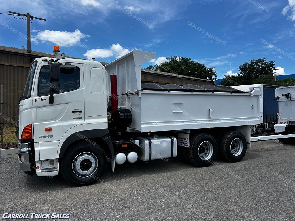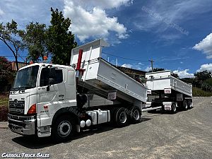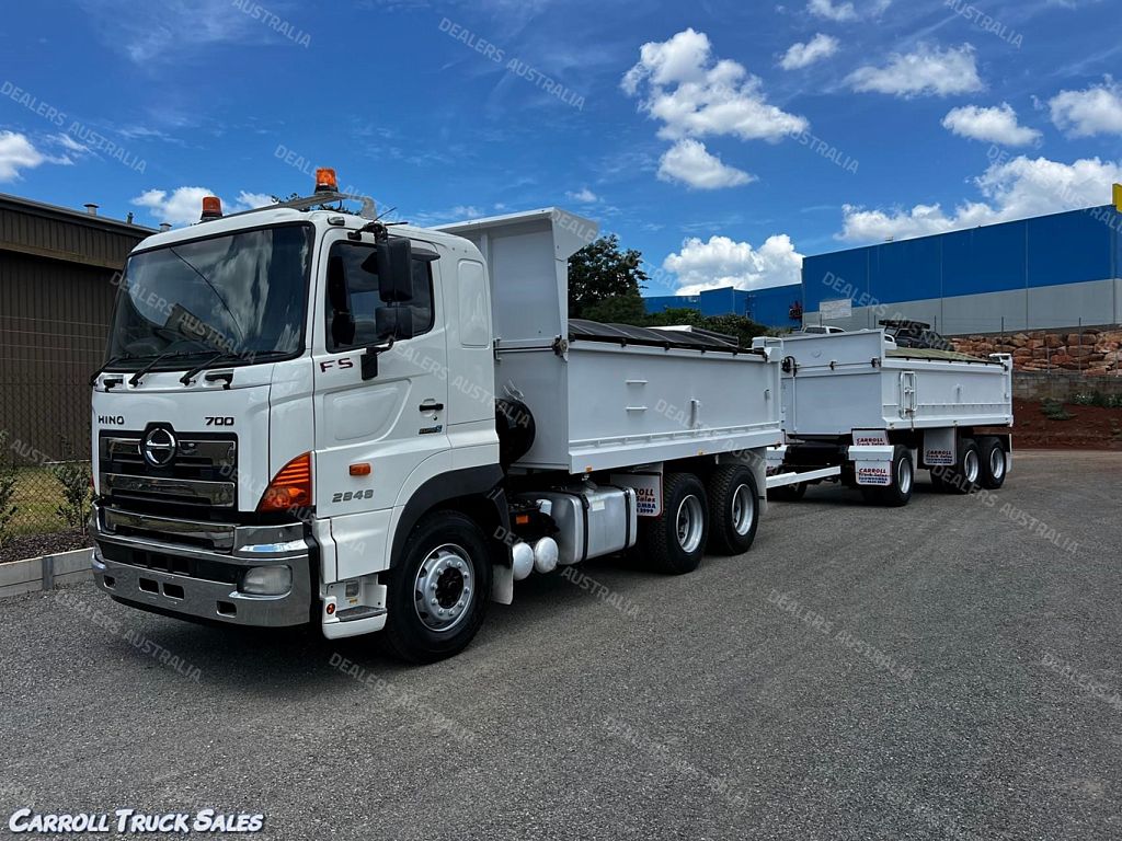2014 HINO FS 700 SERIES 2848, TURBO INTERCOOLED 480HP, 18-SPEED MANUAL, P/S A/C. Immaculate Ex-govt 6x4 bogie drive truck fitted with tipper body. Set up includes truck and dog tipper combo. Truck presents in excellent condition and has been kept well serviced and maintained from new, complete with service history and books. The outfit is a immaculate setup and drives great.