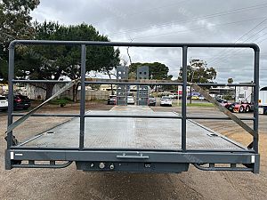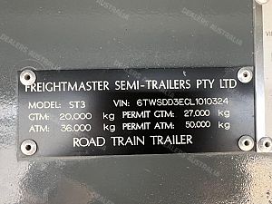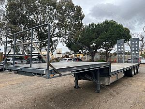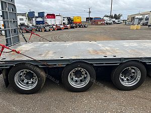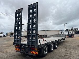 44'6" Long, Container Pins, Road Train Rated with Ringfeder & Air & Electrics to Rear, Electric/Hydraulic 3m Ramps, York Axles on Spring Suspension, Jost Landing Legs, 10 Stud Chrome Wheels, 255/70R22.5 Tyres, 1020mm Deck Height, 2 x LH Side Toolboxes, Water Tank, Front & Rear Loading Racks, Spare & 2 x Carrier, Very Tidy Trailer with Road Train Rating.