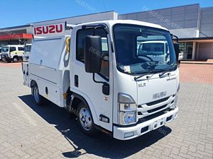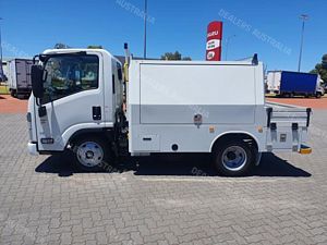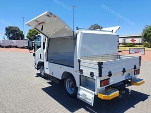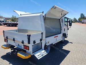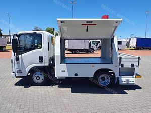 Ex Isuzu Demo (MY21) 2021 Model Isuzu NLR45-150 AMT "Service Body X". Features AMT (Automated Manual Transmission), towbar, under tray storage/toolboxes, reverse camera, and Service body with gull-wing doors on either side.