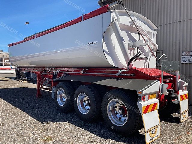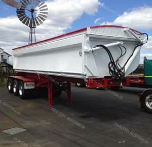 This 2020 Roadwest Side Tipper has a high tensile chassis with one piece top and bottom flange and a 10mm skidplate.The bin is made of 450 grade 5mm hardox with an internal size of 8.4 x 1.35 x 2.45m. She sits on Hendrickson HT230TA15 airbag suspension and K-Hitch parallel bearing drum brake axles with EBS. PVC roll tarp with Rollrite spring loaded arm, LED Lights, Hubodometer, alloy wheels including spare in dual spare wheel carrier, and angled flexiguards. It has a road train cross member and ringfeeder with air and electrical to rear and set up for quad operation.With an approximate cycle time of 30 secs to open door, tip, then down and close door, she's quick and easy to use.